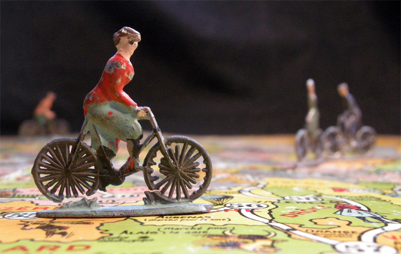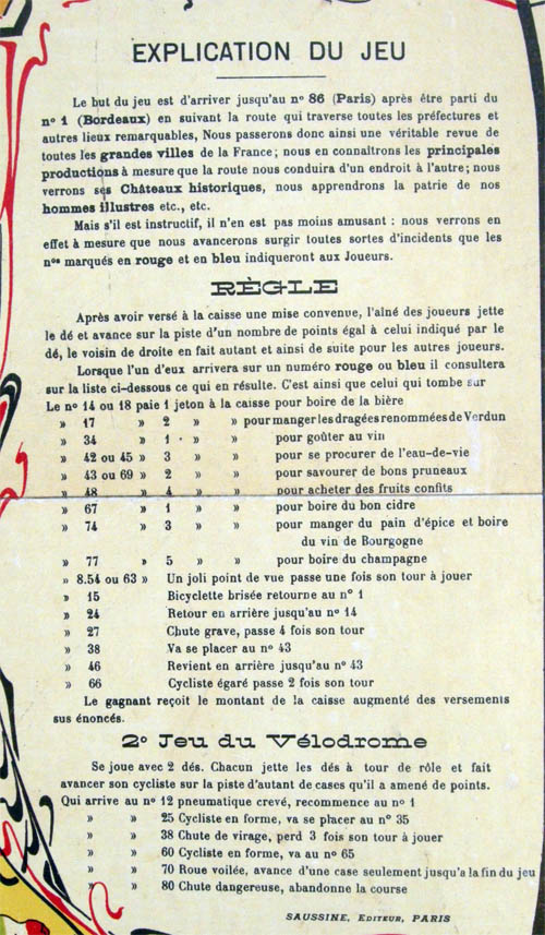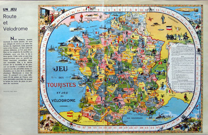 Actually, we have two games in one. In the early editions, both of them were cycling games; one of the games became a car rally over time. The early versions of the rules, which were printed on the game board, are quite simple. (Later versions are also simple, though longer, and were found on the back of the box lid). The rules of the first game are not those of a sports cycling race, but rather a bicycle travel through France, where riders stop to eat and drink local products.
