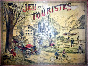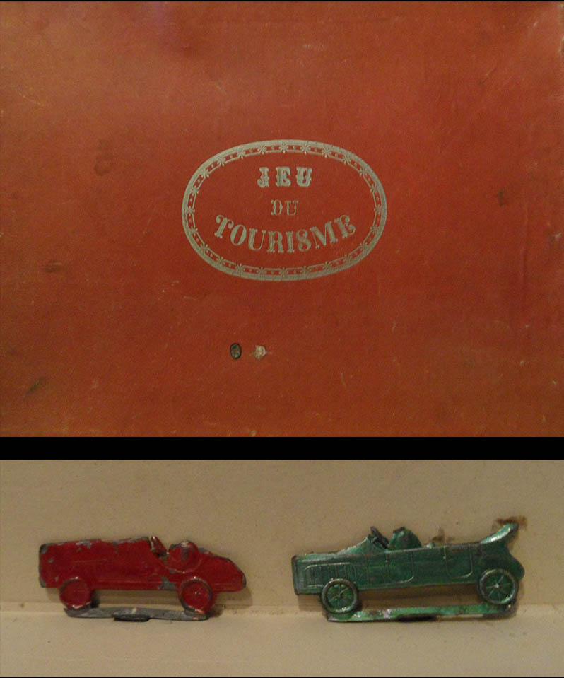 UPDATE 2025: While we knew a pre-WWI version of the game called Jeu des Touristes, we did not exactly know its contents, or whether the game had cars. However, my friend Didier has recently unearthed another version of the game. While the name on the box is just "Jeu du Tourisme" (and there is no illustration on the box top), the board inside is the 1910s version (the one that says "Jeu des Touristes et Jeux du Vélodrome"), and there are a couple of metal cars included with the game. There are no cyclists however; they might have been lost with the rest of the missing cars, or maybe they just were not included in this version of the game.