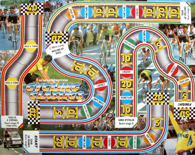 Self published Irish game, dedicated to the great Irich champion Sean Kelly. By the title of the game ("Sean Kelly Edition"), there might be another version of this game (the regular edition) but I have never heard of it. Also, according to Pierre Bertin, there is a much cheaper French edition of this game, with counters instead of cyclists and a very light board.