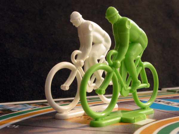 However, when a rider falls in a puncture area, he must wait until he throws a one on the dice or chose to halve his accumulated score. Here is a little strategy. Moreover, punctures are worse for race leaders than for riders with low scores, who do not have much to lose. (Exception: riders with a score of zero must remain une turn in the puncture area if they fail to throw a one).