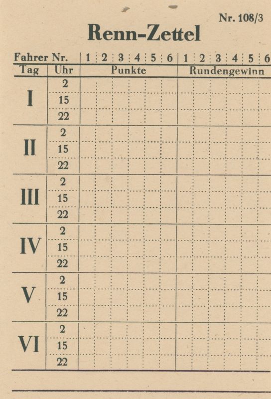 Daniela Merela remarked the race sheet was missing from my copy and gave me one of hers. As you can appreciate (or guess), there were a bunch of those included with the game, and they were stapled together. In case they are missing from your game too, you can use this one. By the way, you can see that the game really represents a six-day race (as opposed to just being named after one, as was often the case in the heyday of six days). One of these days I will have to make a special section with these games (and possibly rewrite all the descriptions too!)