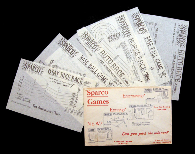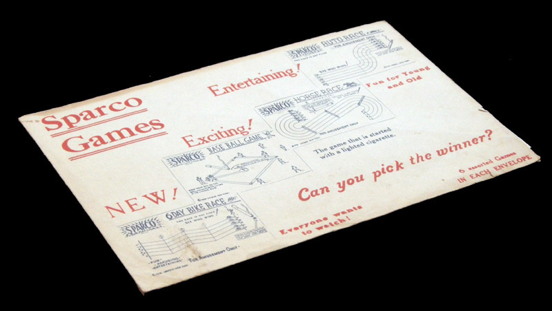Strange as it is, this format (self-destructing games lit is found in different formats (and different subjects) in different countries countries. Whithout leaving the USA I can mention a couple of horse-racing cigarette-lit games: "Magic Race" (horses featured: Dead Indian, Anchor Man, Sun Marks, My Last Rry, Roman Request, and Sailor's Knot), and "Tom Thumb Race" (horses featured: War Admiral, Sea Biscuit, El Chico, and Stagehand). Both of them were made by The Lederer Co., NYC. The former has a "Buy U.S. war bonds" sign, so it is safe to assume that it was made sometime during WWII. The latter features three actual very famous pre-war horses (never heard of El Chico, nor of the six Magic Race horses).