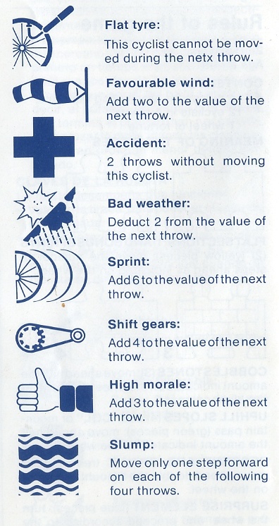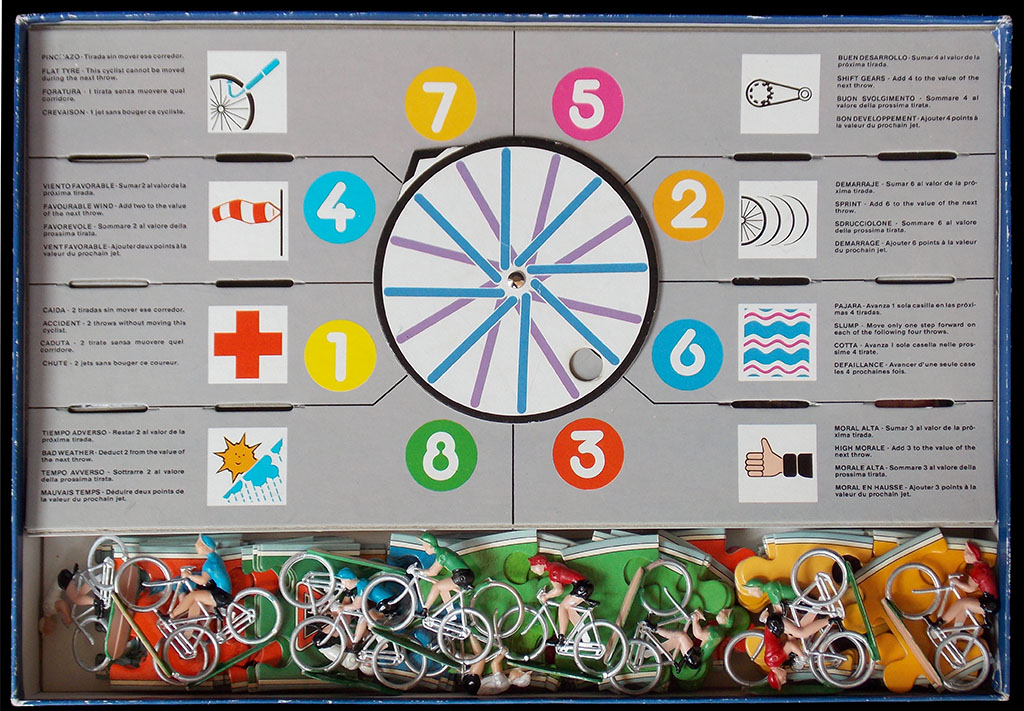 Sprint uses a spinner (called "wheel of fortune" in the rules) instead of dice. The spinner is numbered 1-8, and there are 8 possible race incidents as well (when riders fall on blue fields, you use the spinner to determine the race incidents). As you can see in the picture above, the race incidents are described in four languages (Spanish, English, Italian, and French) but the rules booklet is in 8 (!) languages, the other four languages being German, Dutch, Danish, and Swedish.