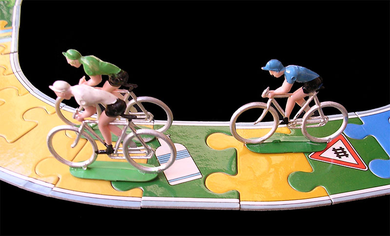 There are four teams of three riders in the game, and the riders may be in any of the two positions (seated / on their feet). It has no relevance to the game. I have had over the time four different boxes and the riders' positions are absolutely random: some teams have two riders in one position (either) and one in the other, and some teams have all the riders in the same position. The rules mention that the hame can be played by up to twelve players (with one cyclist each), but of course some of the riders are undistinguishable (same colour, same position). In the best of cases, providing that you do not have a team with all riders in the same position, you will have 8 different figurines. So, if you plan to have twelve players, you will need to mark the riders somehow.