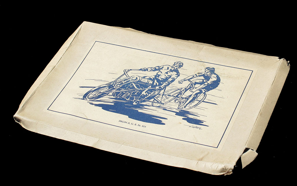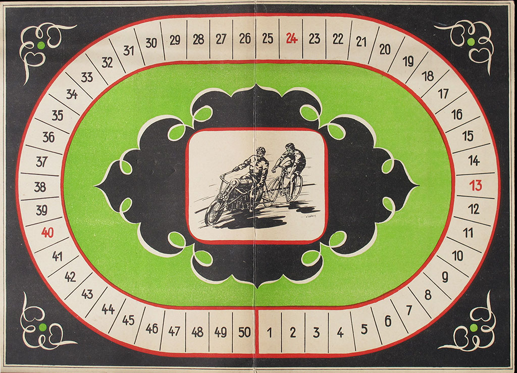 The name of the game is not featured on the box, but on the rules' sheet. The game box just features a fantastic drawing signed by W.Gräber. It depicts an old derny and an old bicyle, but I do not dare to say how old. Motor-paced bicycle races have been around for quite a long time. The world championships started in 1893 for amateurs and 1895 for professionals (Wikipedia). Not bad considering motorcycles are not much older. The internet is full of old pictures of old motor-paced bicycles (here or here, for instance) and I find it quite difficult to date this game just by the picture on the box. The motorcycle and the bicycle are certainly old, but I cannot tell how old. So take my estimation with a pinch of salt. The game might be older.