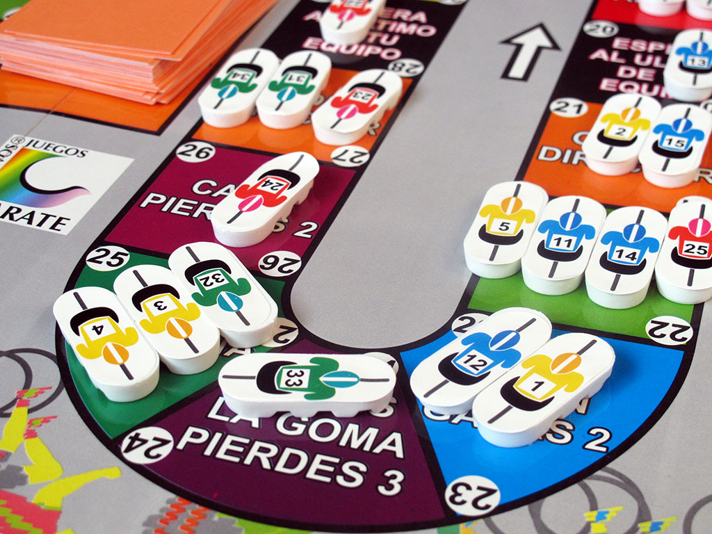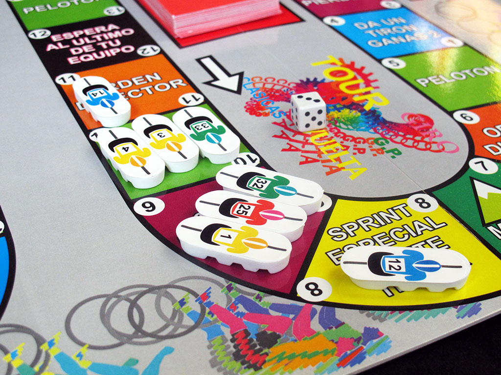 By the way, I have not misplaced the riders. The numbers on the squares are in descending order. This is not frequent, but has an explanation: This is a stage race; when the first rider reaches the finish line the stage ends and each rider adds the number of the square he is on to his GC count.