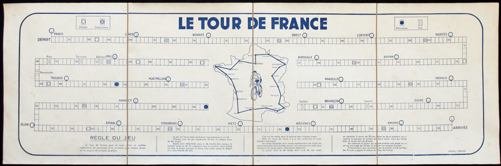 This is another old Tour de France game. Most Tour de France games can be dates as they feature the stages of a particular edition of the Tour, but this one does not. The general shape of this Tour with its 22 stages and the beginnin and end in Paris just hints that this game must be made somewhere between 1928 and 1950. The closest I have found is the Tour of 1939, which has exactly the same first 16 stages than this game, if you do not count split stages and a time trial in Monaco, but which was shorter. The last stages of the game do not match any Tour de France, specially the stage at Épinal, which was not ville-étape until 1954.