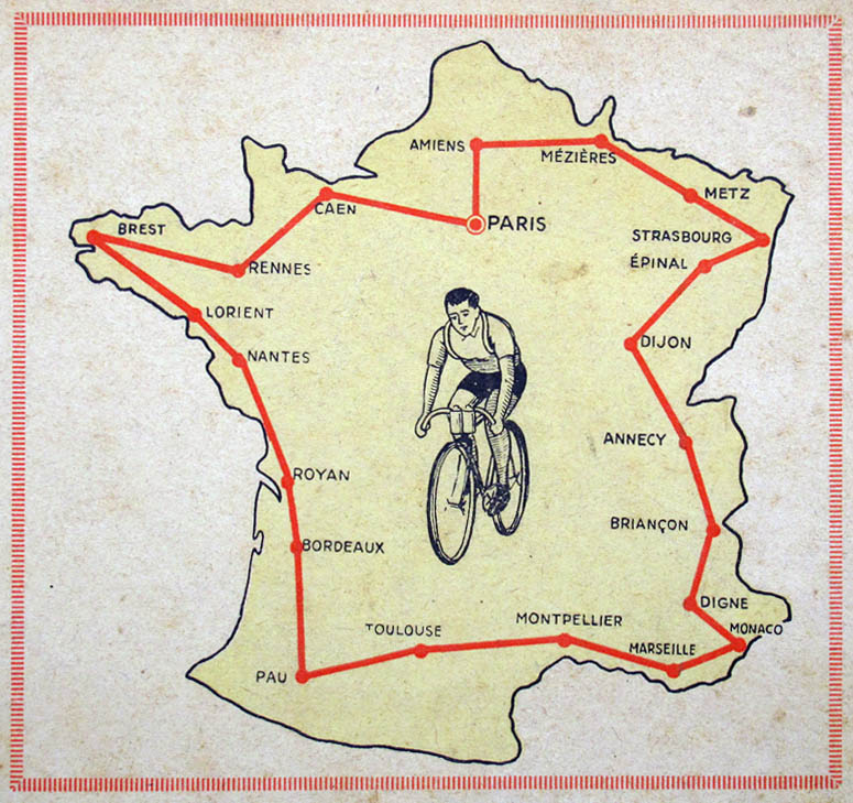 According to the Wikipedia, Henri Desgrange planned a Tour for 1940, after war had started but before France had been invaded. The route, approved by military authorities, included a route along the Maginot Line. I have not found any further evidence, but the stages of this hypothetical 1940 Tour de France might have been quite similar to those in this game.