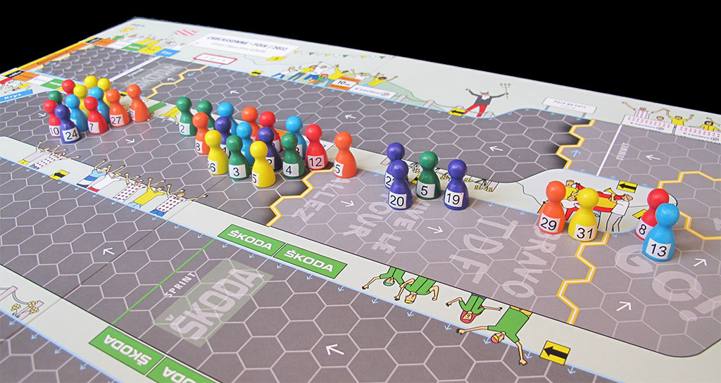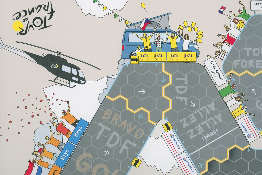 As the name of the game suggests, this game represents a stage race. Inside the box you find two reversible boards that feature four stages of the 2022 Tour de France: the second stage in Denmark, Carcassonne-Foix, the Alpe d'Huez, and the final stage on the Champs Élysées. That is, two flat stages, a hilly stage, and a stage with a mountain finish. They plan to gradually expand the game with additional stages. (Spoiler: the first addition will be 2023's TdF 1st stage in Bilbao). I am told that they also plan to release retro stages from the first editions of the TdF. Of course, at this stage of development of the game, you will have to play each board more than once if you want to play the complete Tour de France.