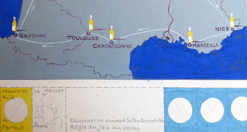 This game was created by Félix Lochard (1874-1951), who had a shop in rue du Verneuil in Paris. It is a gouache painting on cardboard, 27 x 36.5 cms, with the rules handwritten on the back.