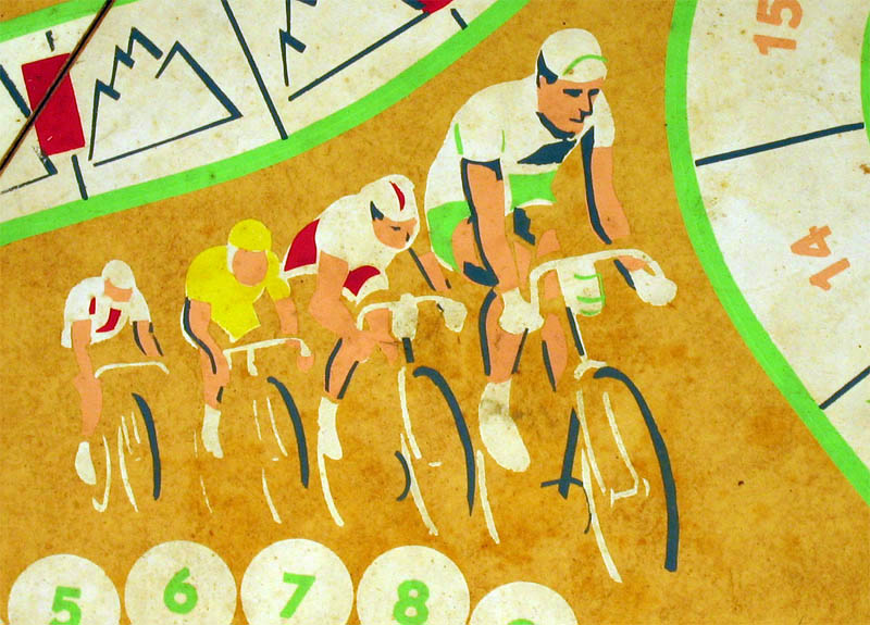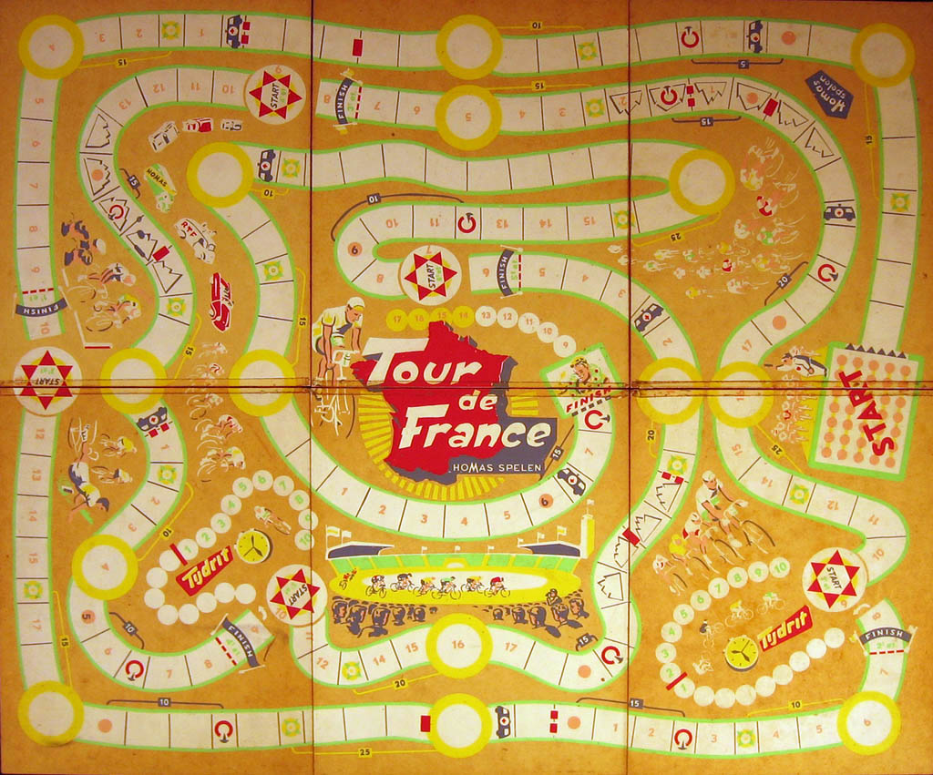 An additional rule is that when you get a throw of three dice with consecutive values (e.g.: 3, 4, 5) you move three riders accordingly plus you distribute the highest throw (in this case 5) between those three riders for an extra advance. This rule looks simple but turns out to be quite messy when actually played.