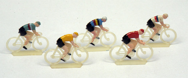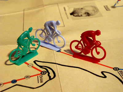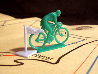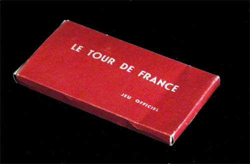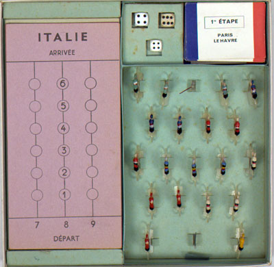 There is another (bigger) version of this game with painted cyclists. Thanks, François, for sending these pics. There are six teams in this version of the game, plus a yellow jersey cyclist. As you can see, one of the new teams is Italy, another is the Netherlands, and I assume the third is be Luxembourg, which would explain the six riders featured on the map.