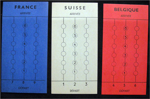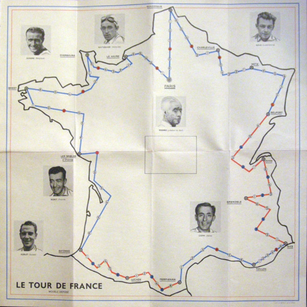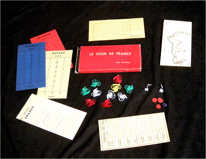 The six riders present on the board are Bobet, Coppi, Koblet, Gaul, Ockers, and Wagtmans. This is enough to date the game to the 1950s. I would say around 1955, since Gaul was not so famous in the first half of the 50s, and Coppi and Bobet were past their prime in the second half of the decade. On the other hand, the stages presented, while they do not correspond exactly to any particular Tour de France, have a disctintive interwar feel, with only 16 stages, the first half of which correspond to those of the Tours between 1919 and 1925. (The route of the Tour did not change much from one year to another back then).