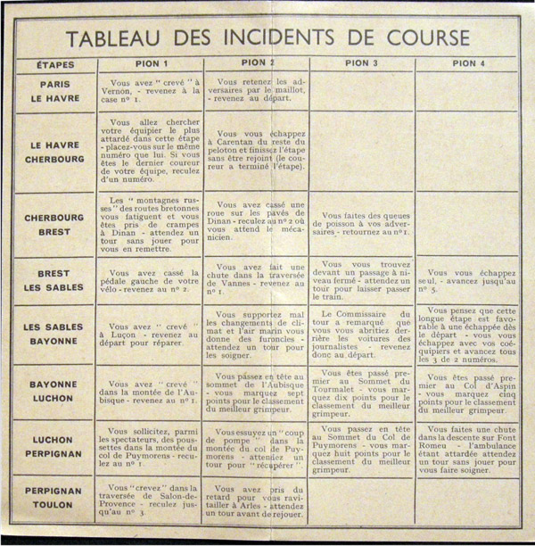 Each stage is exactly 7 fields long and has some dotted spots (on the France map) which represent incidents in the race (according to the table included, see below) for the rider who falls on them. However, these dotted spots have effect only once in each stage. That's why we have four small numbered red counters: whenever a rider falls on one of these spots, he choses at random one of the red counters and checks what is the effect (good ot bad). The counter is pt apart until the next stage. Some stages have less than four spots.