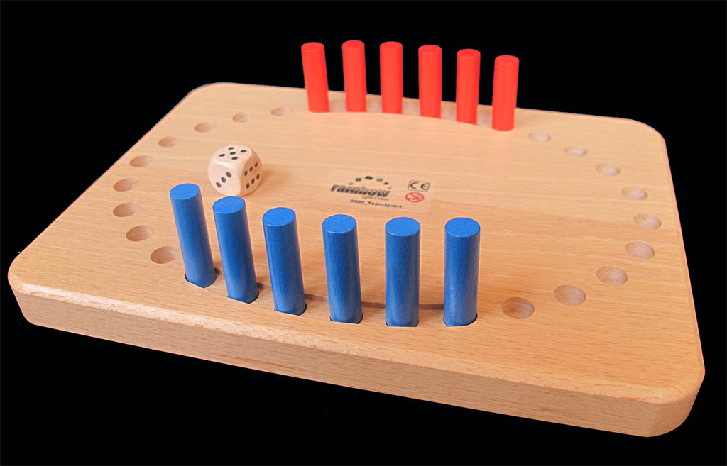 With these restrictions, players move their team ahead, trying to have as many possible moves available in subsequent throws, and the outcome of the race depends more on teams being able to move than on teams rolling high throws.
