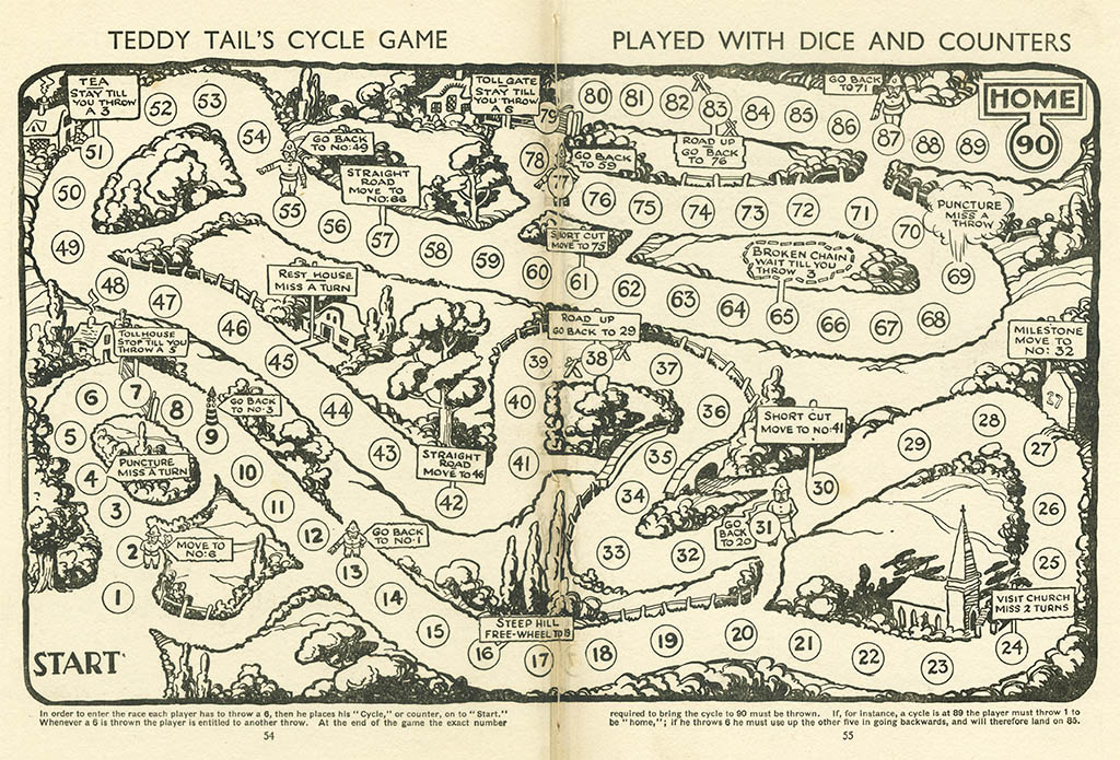 Here is a game published in an English children's annual back in 1934. According to the Wikipedia, Teddy Tail was a British newspaper comic strip about a cartoon mouse featured in The Daily Mail from 5 April 1915. It was the first daily cartoon strip in a British newspaper (being also the first to use speech balloon rather than captions). The character survived until the 1960s with several artists drawing newspaper strips and the varied annuals. Teddy Tail annuals were issued from 1933 to 1940 although there were several undated annuals featuring the first version of Teddy Tail.