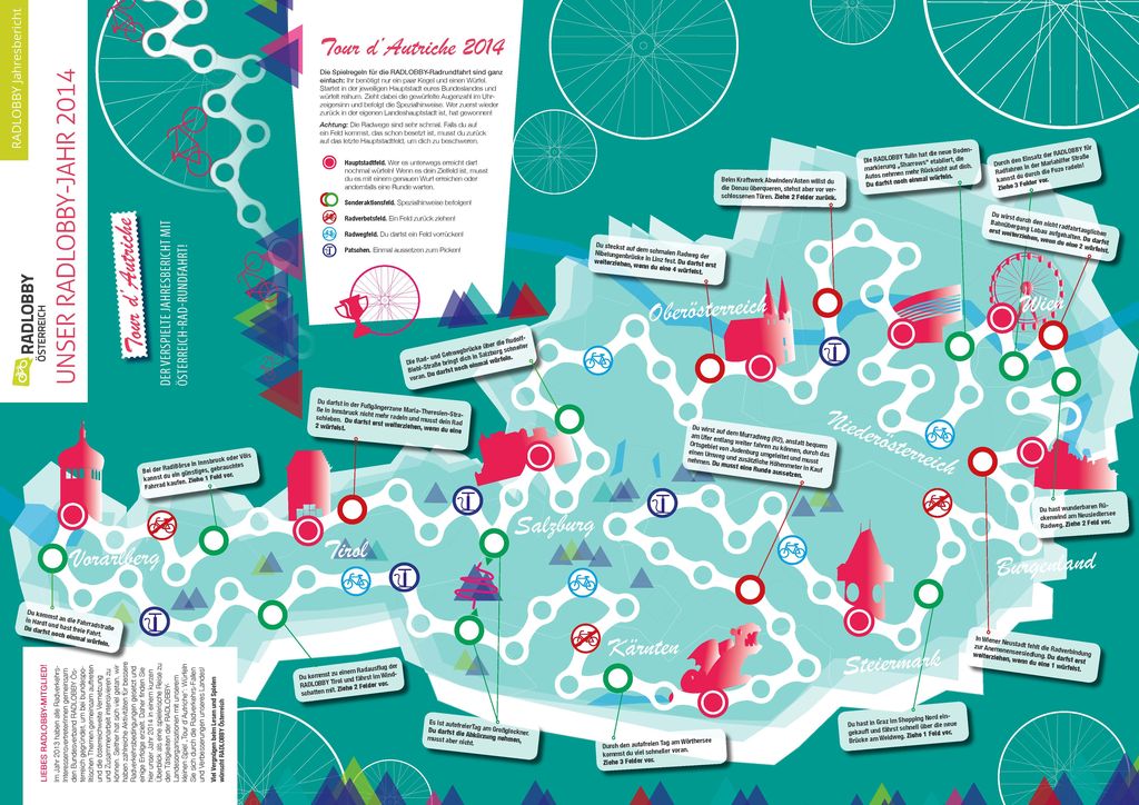 This is a free print-and-play game that I found browsing the net. Strangely enough, it has a French name (though we could also consider it is called "Radlobby-Radrundfahrt"). According to the pictures found in the Radlobby Österreich website it looks like the game was originally printed as a foldable poster (or leaflet) with information about the radlobby on the other side. (This information is also included in the downloadable PDF, see below).