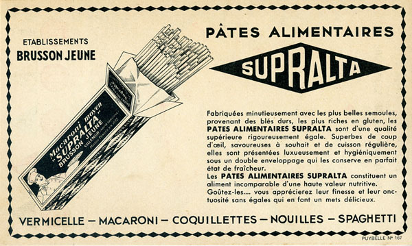 Now let's talk about Pātes Alimentaires Brusson Jeune: The company was founded in 1872 in Villemur-sur-Tarn and quickly grew and branched out into new sectors such as bakery, rusk, and diet products. By the 1930s, it had acquired a national and international dimension. At that time, the BRUSSON factory in Villemur employed 440 workers and employees, and the company had another factory in Belgium. World War II stopped the progress of the company, which nevertheless did quite well until the 1960s, though at the time their production was centred on biscuits rather than pasta. In the 1970s the company was absorbed by Panzani.Had I researched all that when I included this game on the website, I would have never said that the game was made in the 1960s. My current guess is that it is a game made in the 1930s. However, I am not really sure when the Supralta brand, which still exists, was introduced. My guess would obviously be ruined if it were introduced later. Feel free to send your opinion.