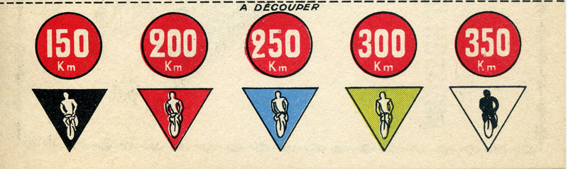 Players draw one of the 5 chips (from 150 to 350 km) and advance if the value of the chip is higher than the length of the stage they face, or else stay if it is not so. The game is equivalent to playing with a D5 die and having to throw at least 3, 2, 2, 3, 4, 5, 5 (the Alps!), 3, 5, 4 (the Pyrenees), 2, 2, 2, 2, 2, 3