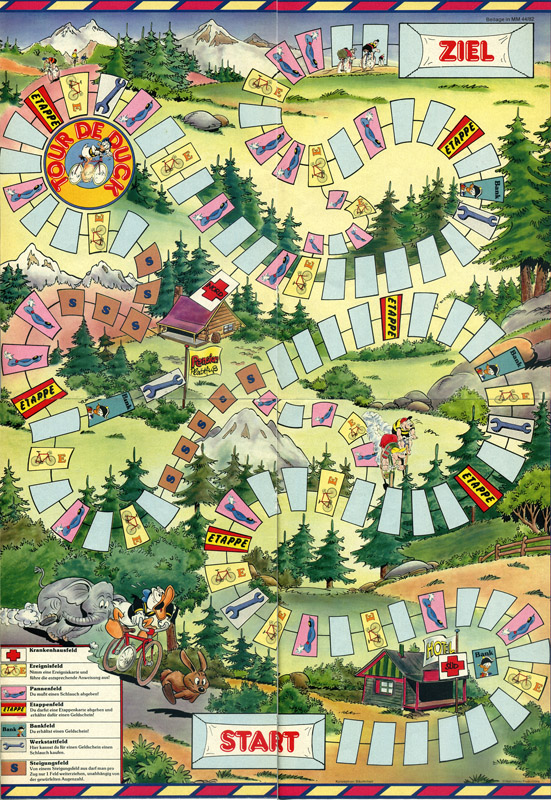 "Tour de Duck" was originally featured in the German Micky Maus magazine, divided in two parts (issues 42 and 43 of the year 1982). It's subtitle (Das tolle Radrennspiel) means "the fantastic cycling game" (thanks, Siegfried, for the precision with the translation).