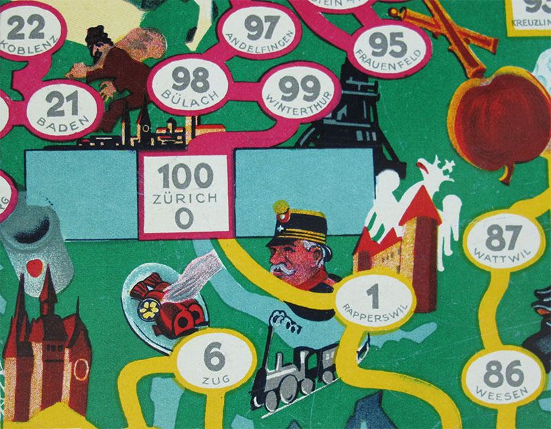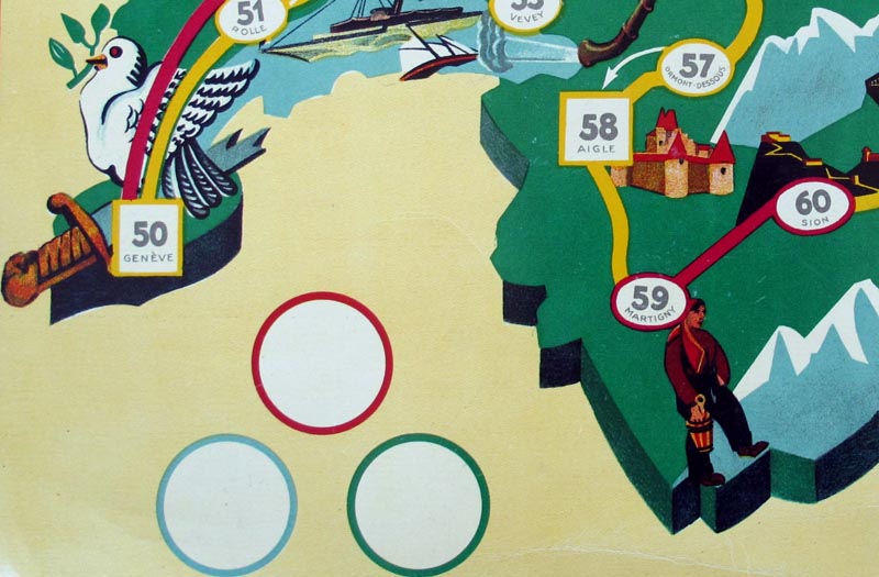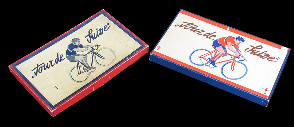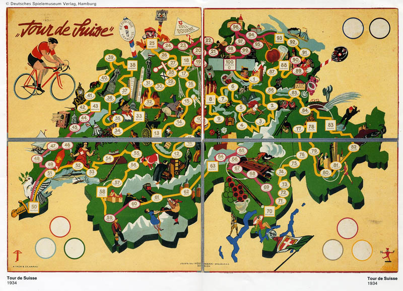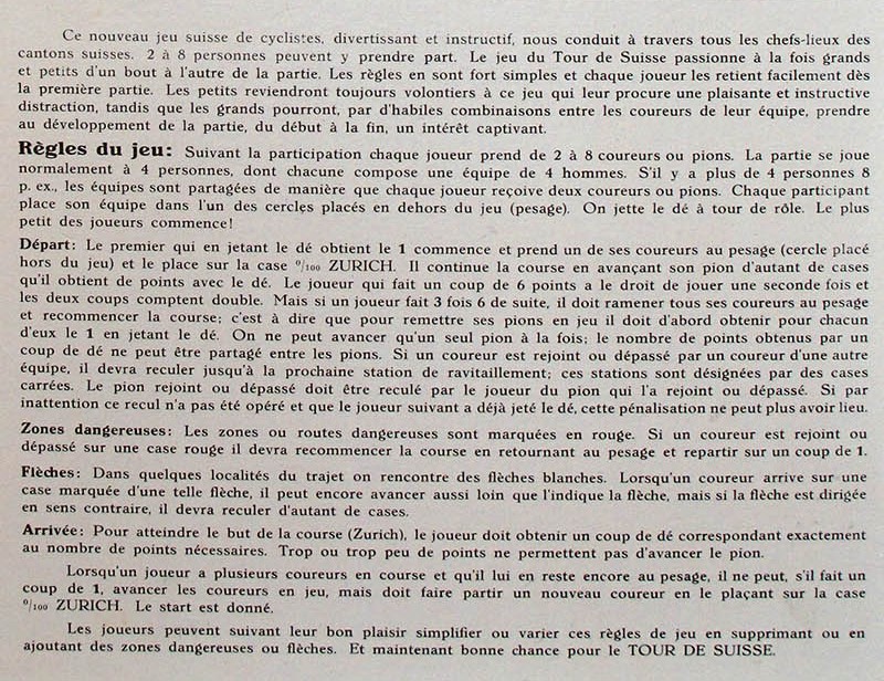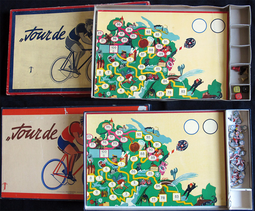 This old Swiss game has proven to be hard to find. It was first mentioned to me almost fifteen years ago by the late Geert Lagrou, who sent me a picture of the game he had found in a book (see below). In these years I have seen the game for sale only a couple of times, until I was lucky enough to stumble on a copy of the game. That was the box you can see on the left of the picture above, and I guess we can call it the poor man's version of the game. And then, just a few months later, I received an email asking if I was interested in buying the box you see on the right, complete with metal riders. Of course I was!
