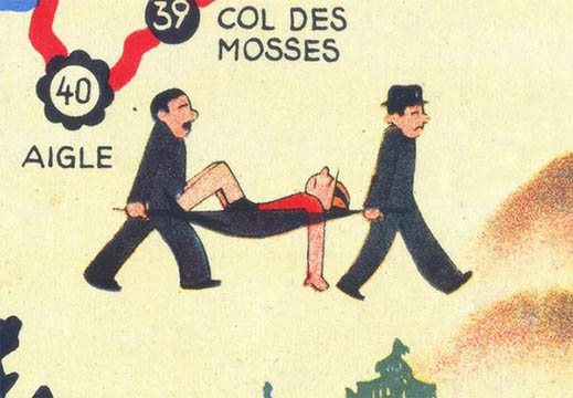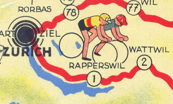 This is a promotional game for a store in Olten. The 1935 edition of the Tour de Suisse had a stage finish in Olten, which was not common (it happened again in 1948, and there we had to wait until the 1970s to find another stage finish in Olten). Having a stage finish in town is a good excuse to make a cycling game, specially if you have a bike shop.