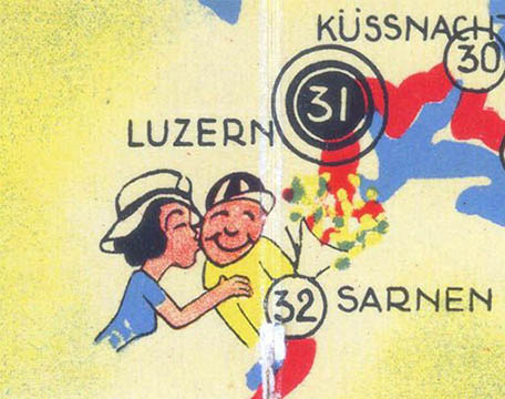 On the bottom right corner of the board we find a the name of a Zurich publisher of which I only know that he was active in 1945-46 from a different address in Zurich (in Dreikönigstrasse), at the end of the forties in Zollikon, again in Zurich in the early 60sand in Aarau in the 1970s (unless there is more than one publisher with the same name). If he was in Hotzestrasse BEFORE moving to Dreikönigstrasse, it would mean that this board is probably from 1935 and that my "touch and feel" instinct is completely wrong in this case. On the other hand, if the printer moved to Hotzestrasse later, that would mean that this board is probably a reissue of an older game.