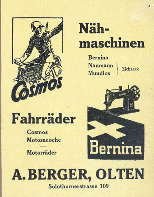 - The Bernina sewing machine would also be from the 1930s, as Bernina produced the first sewing machine for home use 1931. The model in the 1940s differs from the one in the add.By the way, Martin tells me that he has seen a copy of this game with the Cosmos promotion only.