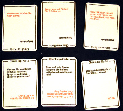 Of course, my understanding of German is quite limited, but not that limited. Basically, the players throw the dice and if they fall on black, orange or red square (and there are lots of these) they take a card and follow the instructions or try to answer the question on the card. The funny thing is that ALL the questions are about the Deutschebahn. (Example: "Was kostet der Mitfahrer-Sparpreis 2. Klasse?" The answer, of course, is "90 DM". Everybody knows that).