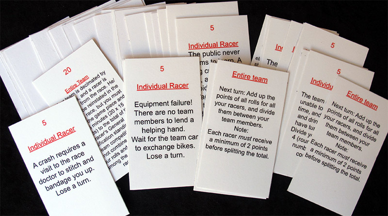 The game features some "events" cards. Every time a rider moves ahead a tile, he must draw one of these cards. Most of the cards are blank, and the rest are mostly bad news (though not all of them are). Cards must always be displayed for all the players to see, their instruction followed at the player's next turn and returned to the bottom of the deck.