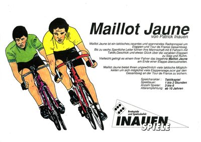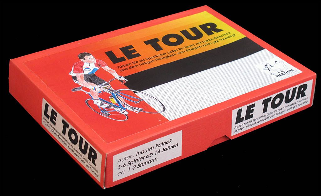 This self-published game is a kind of underground classic. It was first released as "Maillot Jaune" in 1995, and then as "Le Tour" a couple of years later. It was a limited edition of 100 numbered copies (mine is nš 53). It is one of the games that appeals to hardcore gamers since it does not depend on luck, or not too much. The game includes two dice (a regular D6 and a coloured die), but they are used just to determine the result of the race incidents (event cards). The normal development of the race, the movement of the riders, does not depend on luck.