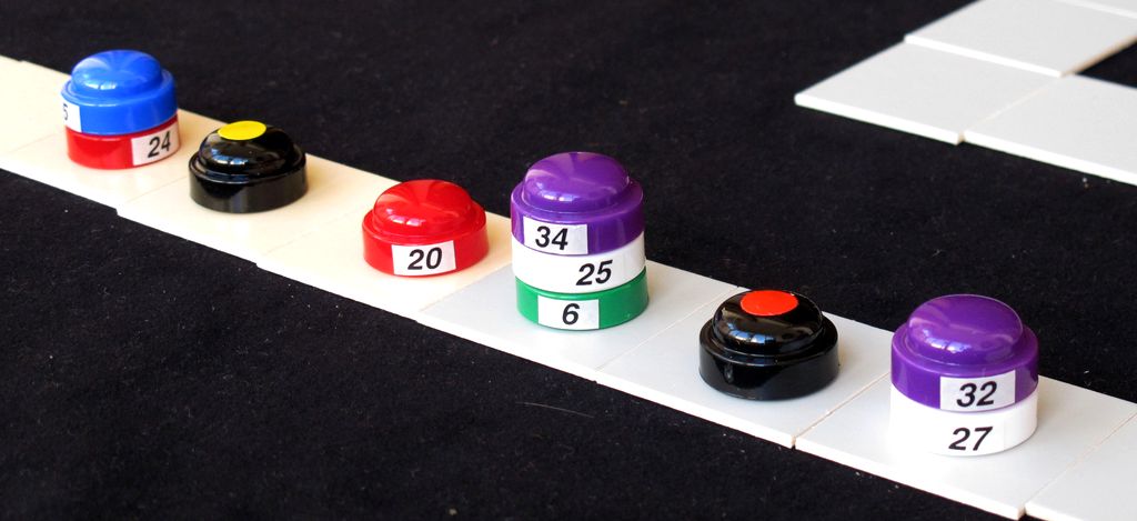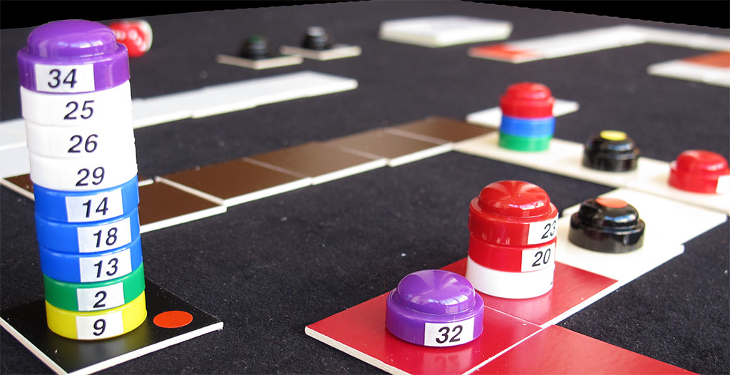 The black counters with coloured dots represent pelotosn of more than six riders, which are kept aside on a black square with the same dot. The counter with the yellow dot represents the main pack, all the remaining riders that are not placed on the board. Smaller packs are represented by up to six counters one on top of each other.