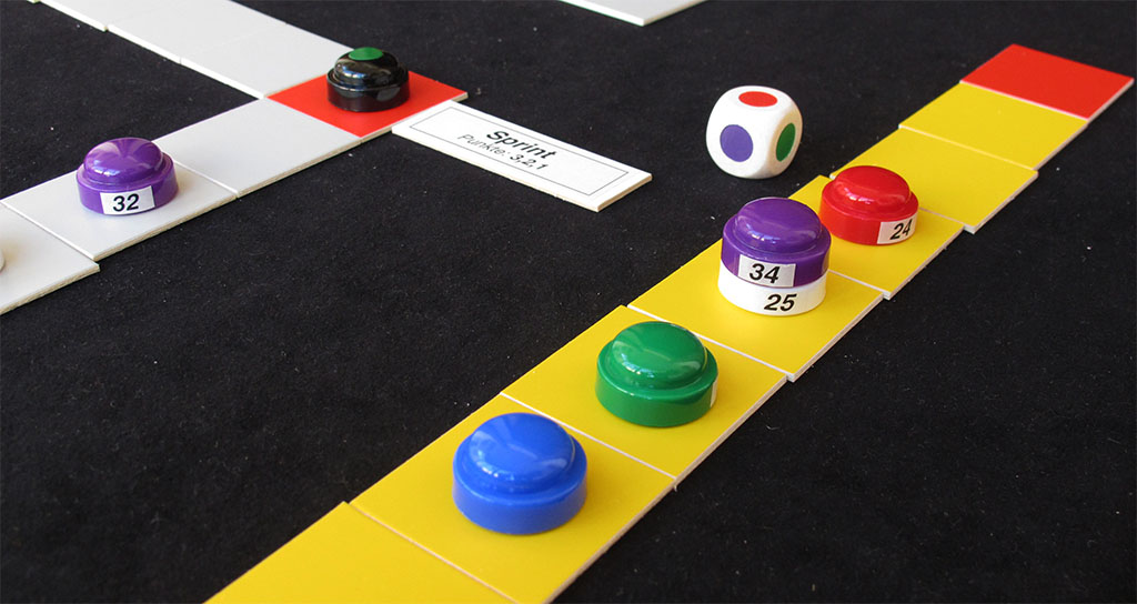 The sprints take place in a different track (seven-squares long yellow track). When a group or peloton reaches a red sprint square, one rider per team takes part in the sprint, which has its own special rules. When the sprint is finished and point are awarded, the race is resumed. Of course, the race ends with a final sprint (or with a breakaway rider winning the race, of course).