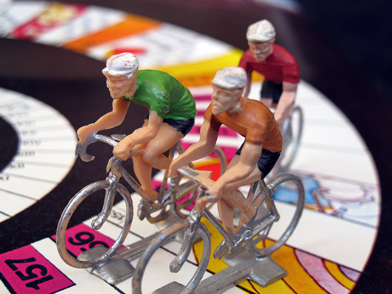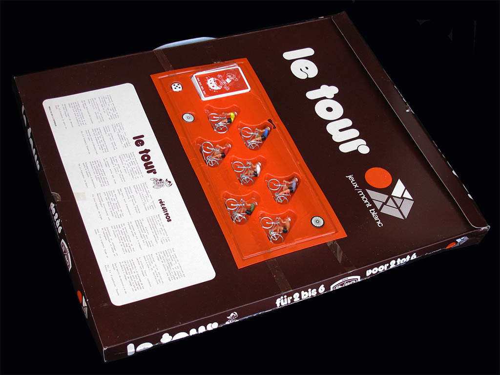 These seven riders are the 70's type smaller Cofalu (as opposed to the bigger later ones, found in games like L'Echappée Infernale or Criterium). As many other (mostly French) games, the seventh rider (the one with the yellow jersey) is included to replace the leader. The game is thus for a maximum of six players.