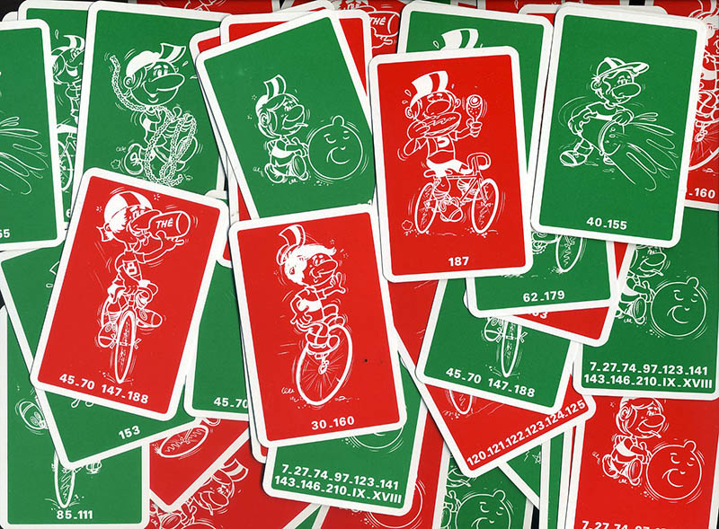 Whe a rider falls on an orange field, he draws a card that he chooses between two packs. The pack "Echappée" includes 30 cards, with numbers between 1 and 10 (3 of each), that represent an extra advance.