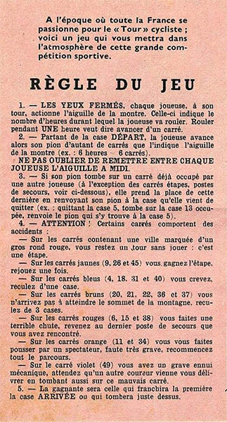 According to the rules, the game is played by "joueuses" (female players). The spinner (which you have to cut and mount, of course) is supposed to be a clock. The number spinned is the number of hours that the player rides her bike... which, of course, is the number of fields that she moves on the board.
