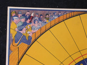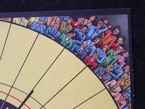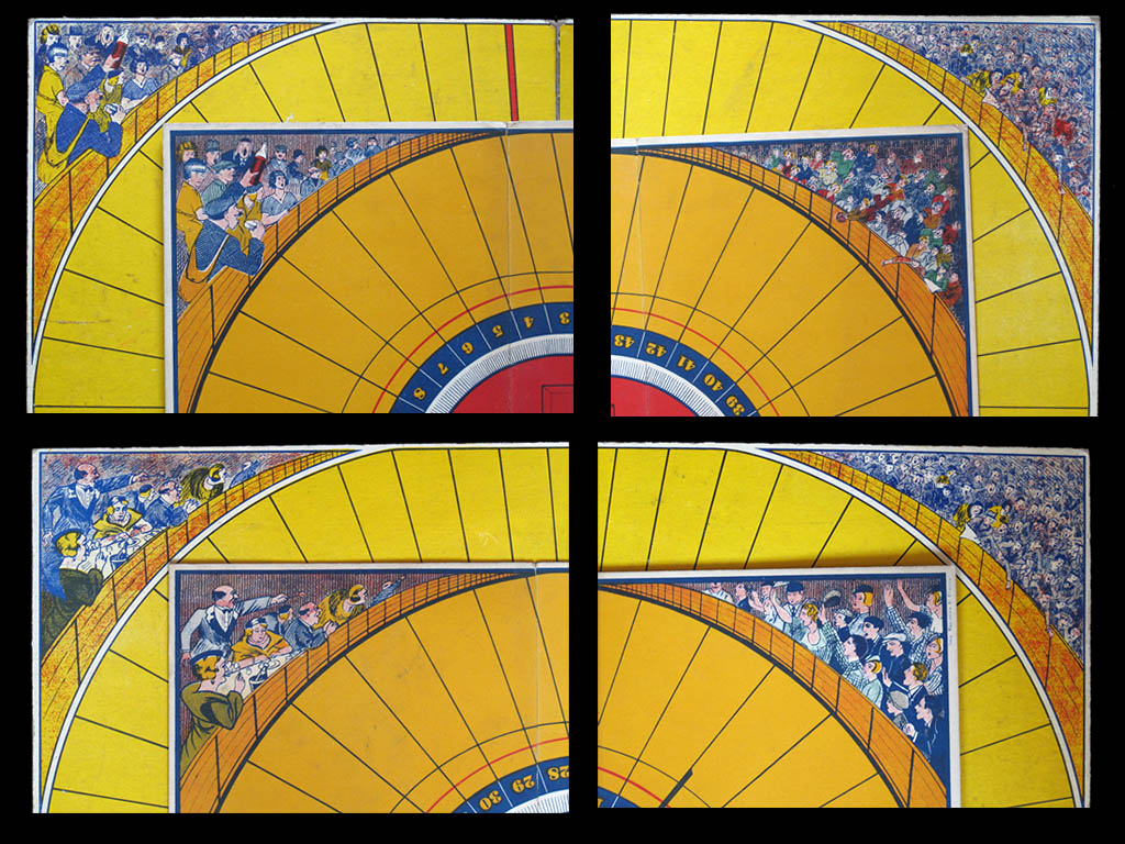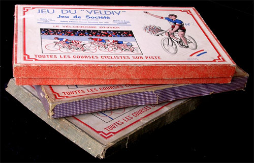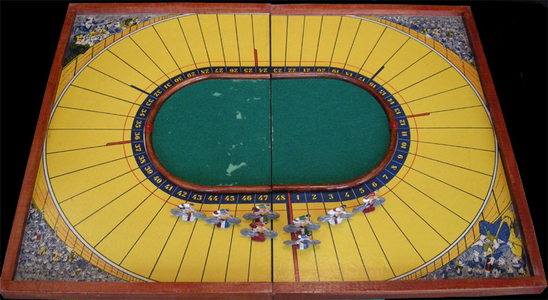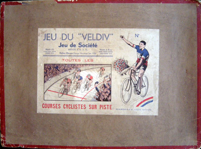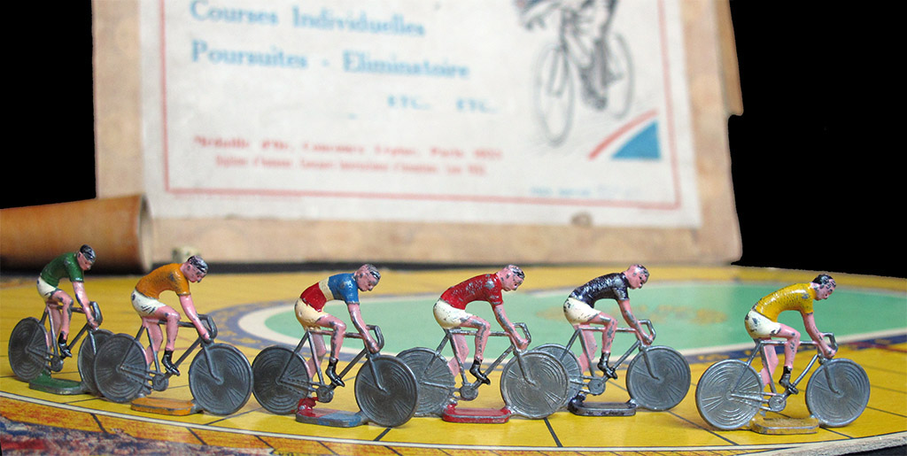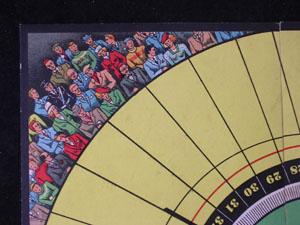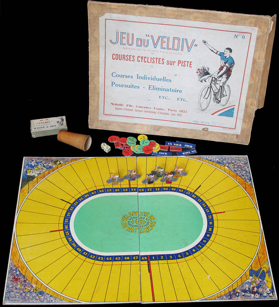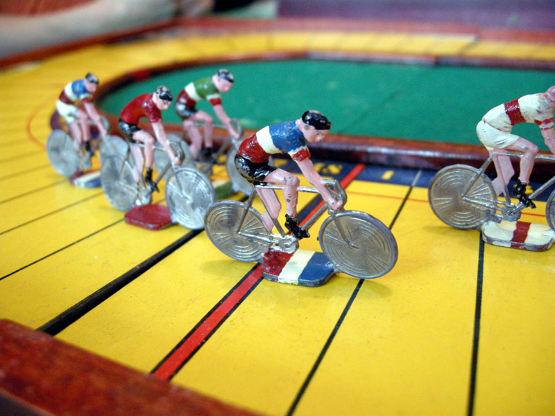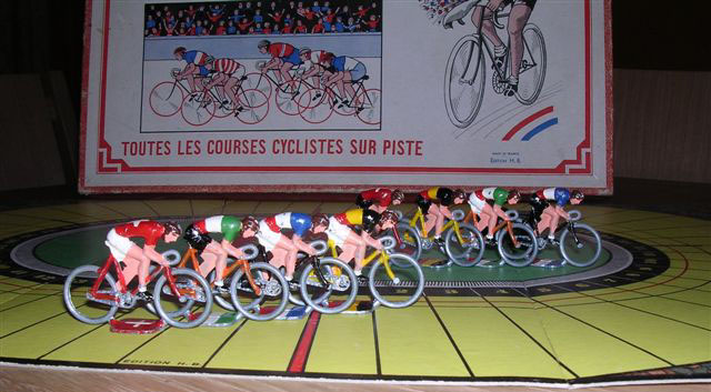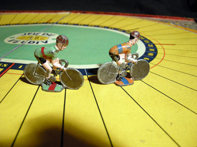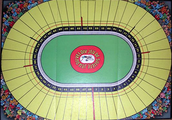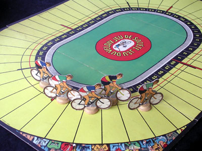 forme ovale, divisée en 48 cases numerotées, de coureurs cyclistes de couleurs