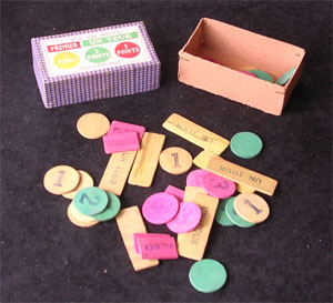 à départager les équipes) , de deux dés, de jetons ronds coloriés, numérotés de 1 à 3,