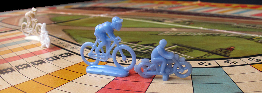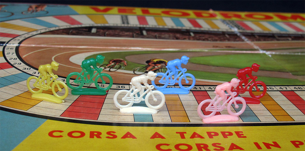 The rules mention five different types of races, one of them being a stage race, in which there is even a "king of the mountains" classification. (You may not see clearly on the picture of the board, but the squares 25 and 73 are marked with the letters "G.P.D.M." which mean "Gran Premio della Montagna"). This special squares, as well as the other two on the board, "Guasto" (breakdown) and "Caduta" (fall), are only used in the stage race. In spite of these stage race rules, I add this game to the velodrome games list.