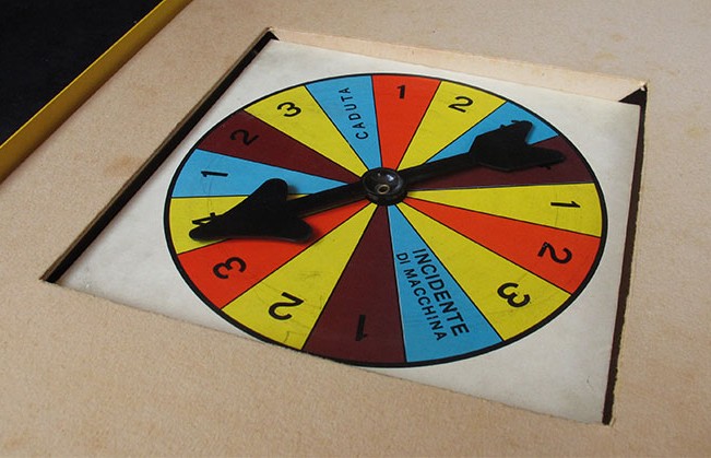 This game, though purely luck-dependant, does not use dice but a spinner, which is conveniently located in a depression in the box so that it does not damage the board.