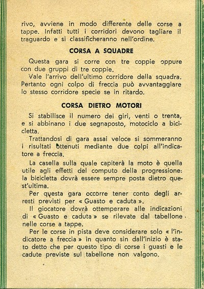 By the way, these are the same rules found on the other version of the game. It is obvious that they do not belong there since the board is quite different. Try, for instance, to play a "corsa a sei" (six rider race) on a board with just for lanes!