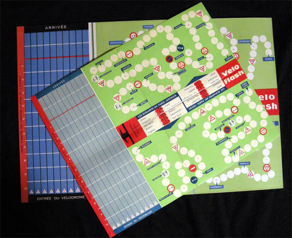 The game consists of two parts. The first part is played on the green part of the board, and it is a dice game. The sprint of the race is played on the "velodrome" (blue) part of the board and uses the aleatory record.