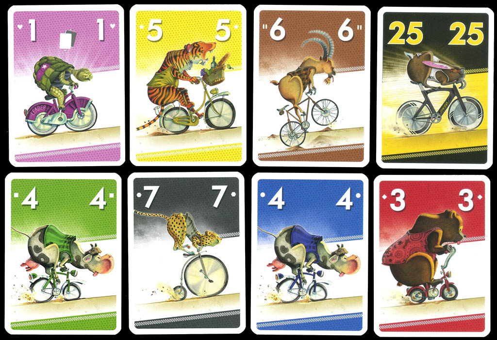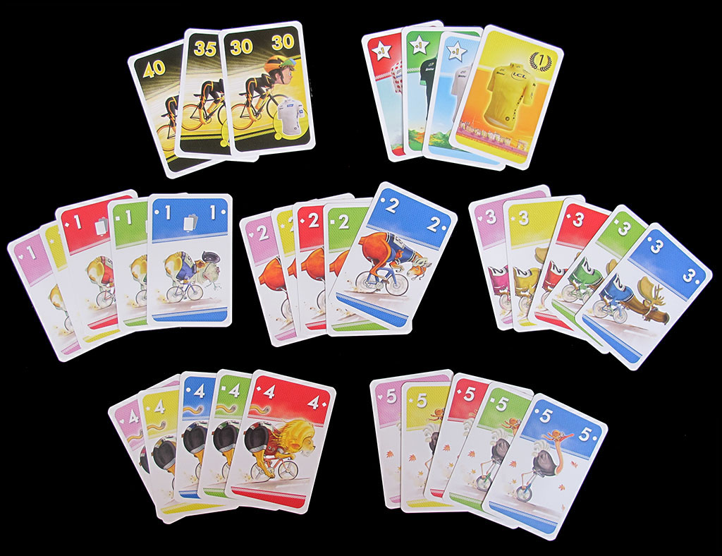 The game can be played by 2 to 5 players, though the rules for 2 players are a little different (as is quite usual in modern games). It is played with a deck of 56 cards: seven cards (numbered 1 to 7) in seven different colours, six special ("hare") cards with values between 35 and 50, and a special KOM maillot card.