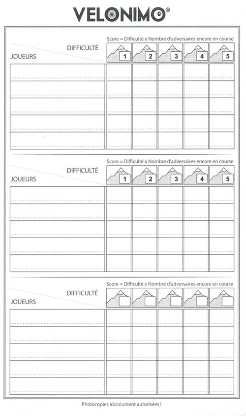 As you may deduct from the score pad the game is played in five rounds (climbs) of growing difficulty (value). In each climb a player scores according to his place in the race and the difficulty of the climb (for instance: in a four-player game the three point climb scores 9, 6, 3, 0)
