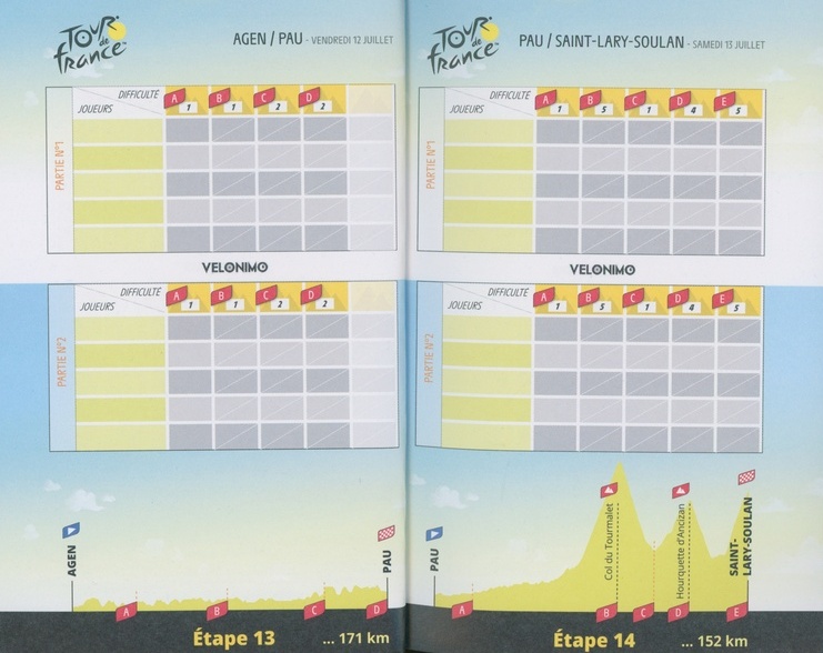 On the other hand, the "Official Bloc-Score" with the stages of the 2024 Tour de France can be played with either version of the game. Each stage consists of four or five hands to be played, with different degrees of difficulty, according to the stage profile. Time Trials are different, with just one hand to be played but with a higher degree of difficulty. The drawback is that such a Tour can only be played a limited number of times. As you can see, there is space for just two games on each stage page, and there is space for two more on the second half of the booklet. So, you can only play the Tour four times unless, of course, you erase the results. Even with that limitation, the booklet is a nice addition to the game.