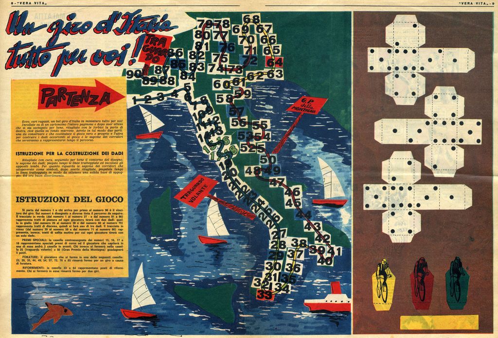 Giro d'Italia-themed game of goose included with Vera Vita (year XX, nš 29, may 3rd, 1964). Vera Vita ("True Life") was a weekly youth's magazine issued by the Jesuits, with religious content on almost every page, as you can guess by the front page. (Compared to it, Azzione catolica's Il Vittorioso was quite mild).