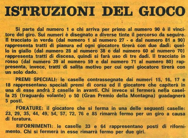 We have also the "Traguardo Volante" (intermediate sprint) and the "Gran Premio della Montagna" (mountain pass) in which you move 5 squares ahead (in both cases) and 4 mysterious special prices (fields 15, 16, 17 & 18) in which you should advance two squares, but it is not specified if you should do it twice if you fall on squares 15 or 16 (in which you advance to 17 or 18).
