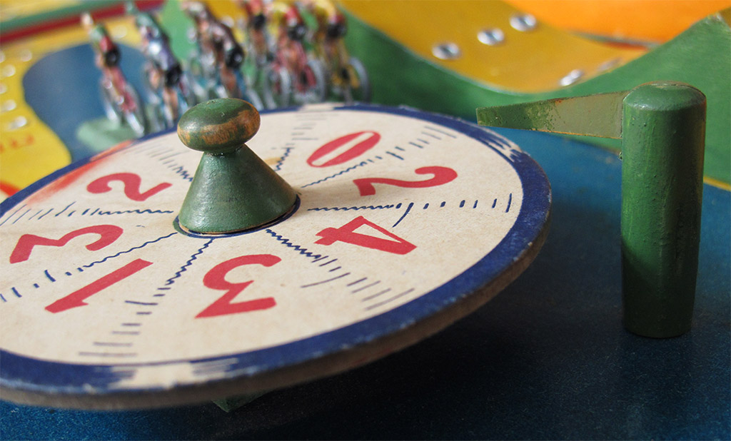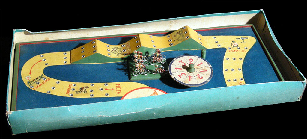 The open board measures 61 x 50 cms It is a two-folded wooden panel with rivets where metal riders are inserted. Riders are moved according to the result of a spinner, and the game is a roll-and-move game (in this case, spin-and-move). The really outstanding feature are the three-dimensional mountains. (33 / 35 mm high),