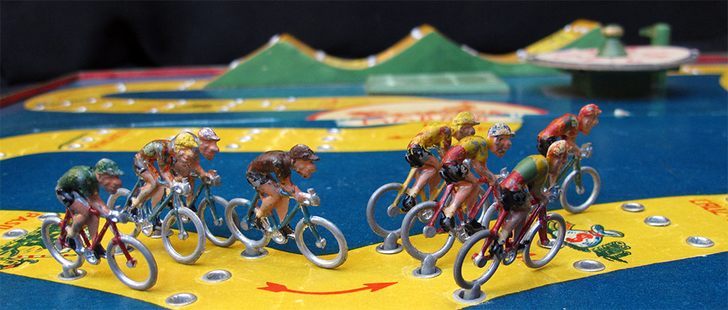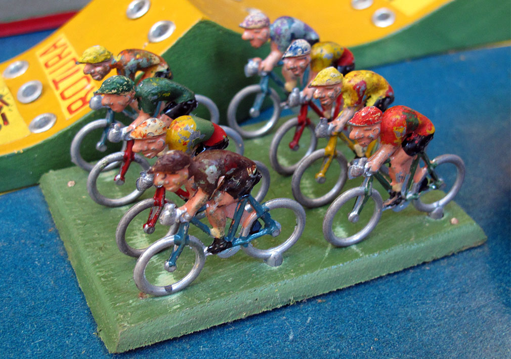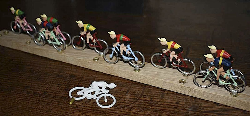 British artist Martyn Overs has decided to try and make his own version of the game after seeing it in my website (which makes me really happy). He has sent this picture of the riders he has made. He has glued a spigot to a plastic figure (somewhat bigger than the original), then made a heat proof rubber mould and poured lead free pewter into it. The result is quite good considering it is all done by hand without a centrifuge nor any compressed air injection facilities. I cannot wait to see the result when he eventually makes the board!