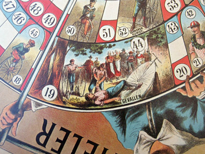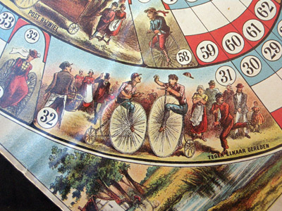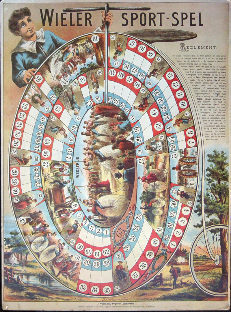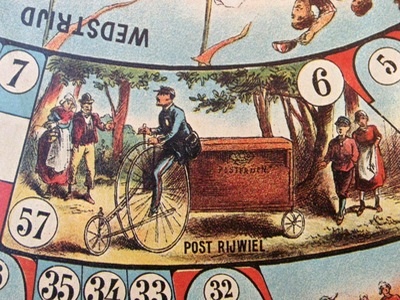 UPDATE 2024: Sigfried L. points out that in this game there are two tracks that run in opposite directions, the red track going counterclockwise from the outside in, as is usual in games of goose, and the blue track starting from the centre and running clockwise. As this game is almost a classic game of goose, we find the two usual "dice squares" though, instead of being on squares 26 and 53, they are on 21 and 42 to keep chances on both tracks equal. Nevertheless, Siegfried also remarks that the blue track is favoured since the "gebroken rijwiel" (broken wheel) and the "gevallen" (fall) squares, which have the same effects on the game, are unevenly positioned on the different tracks. On the red track, a player on square 62 throwing a sum of 6 or 12 will inevitably land on the "broken wheel". The chance of this happening is 16,6 % (6/36). On the blue track, however, a player on square 62 can land on the "fall" (square 44) only when throwing a sum of 10 (8,3 % chance). That is subtle! Thanks, Siegfried, for sharing your thoughts. The day we play this game I will let you choose the track.
